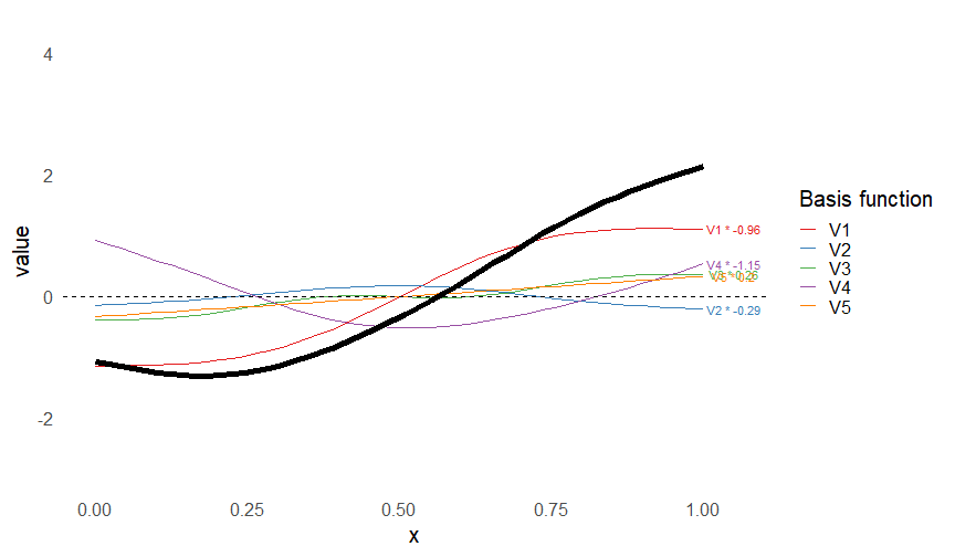 \[ s(x) = \sum_k \beta_k b_k(x) \]