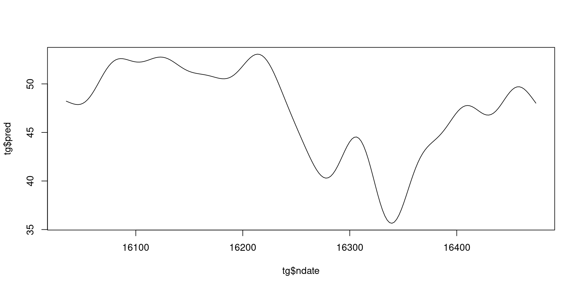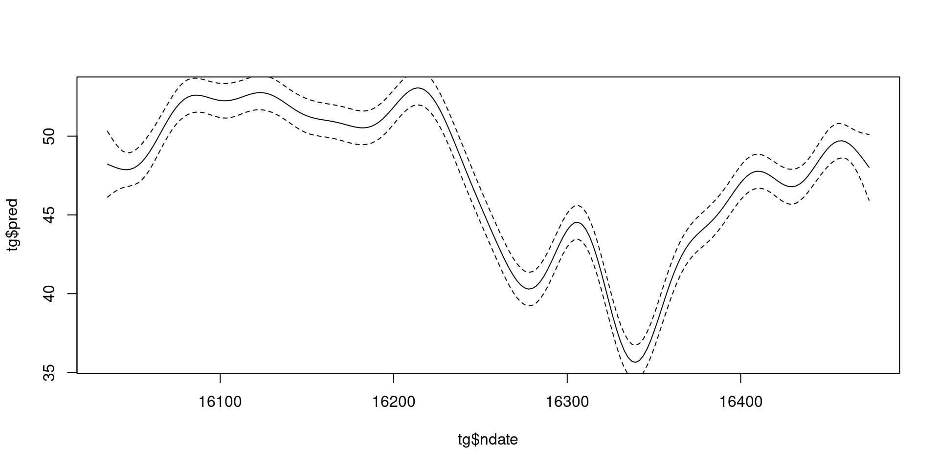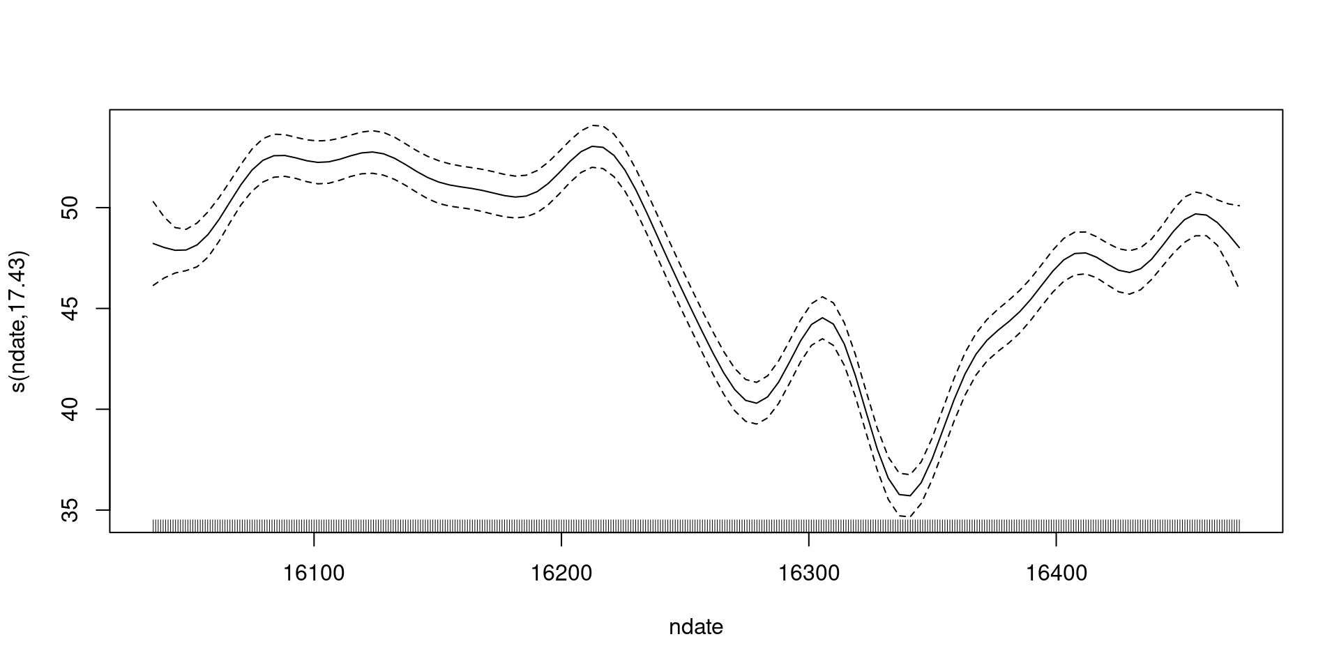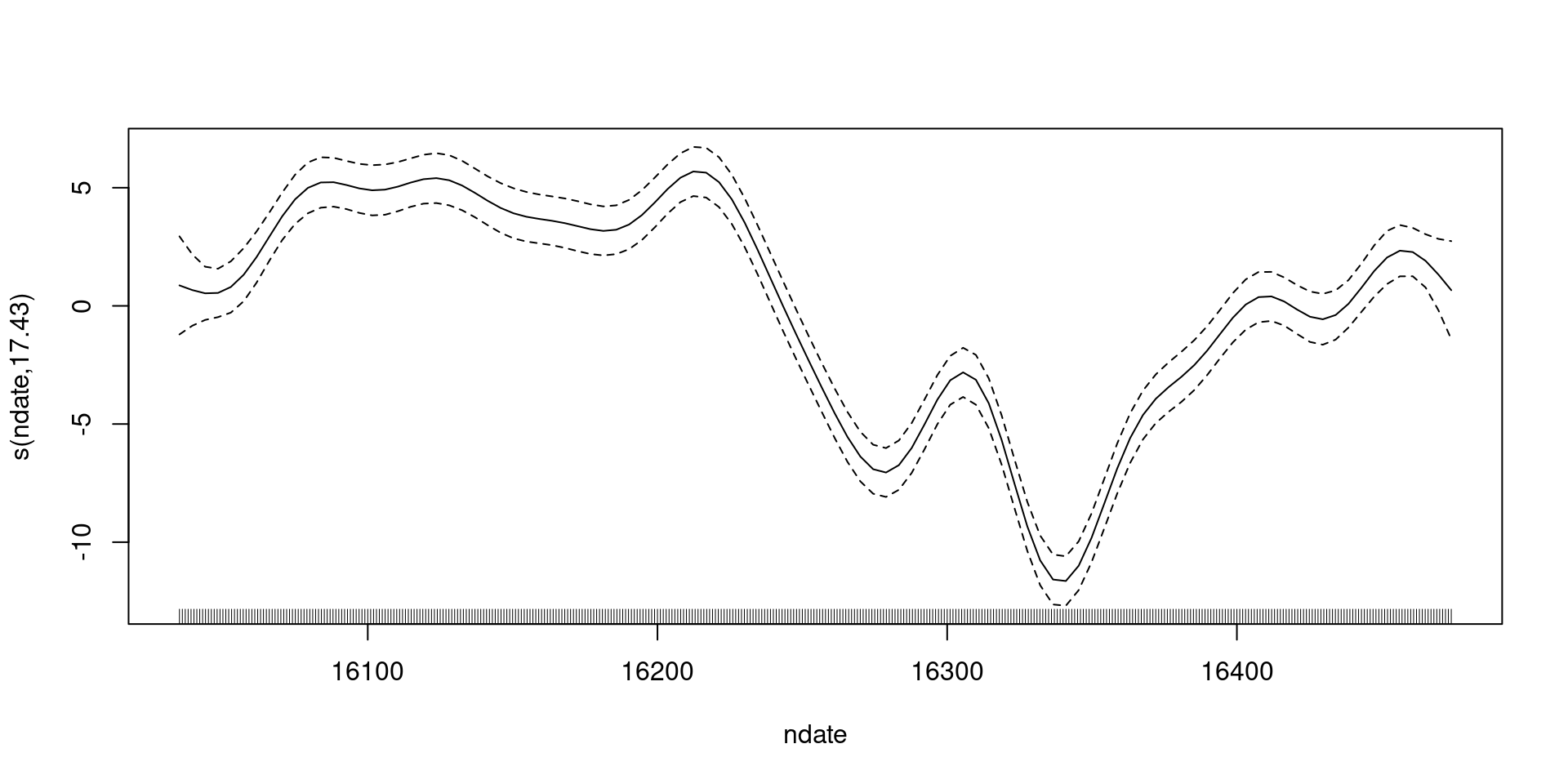 gam() to fit a modelsummary() to assess itplot() to visualise it(Intercept) s(ndate).1 s(ndate).2 s(ndate).3 s(ndate).4 s(ndate).5